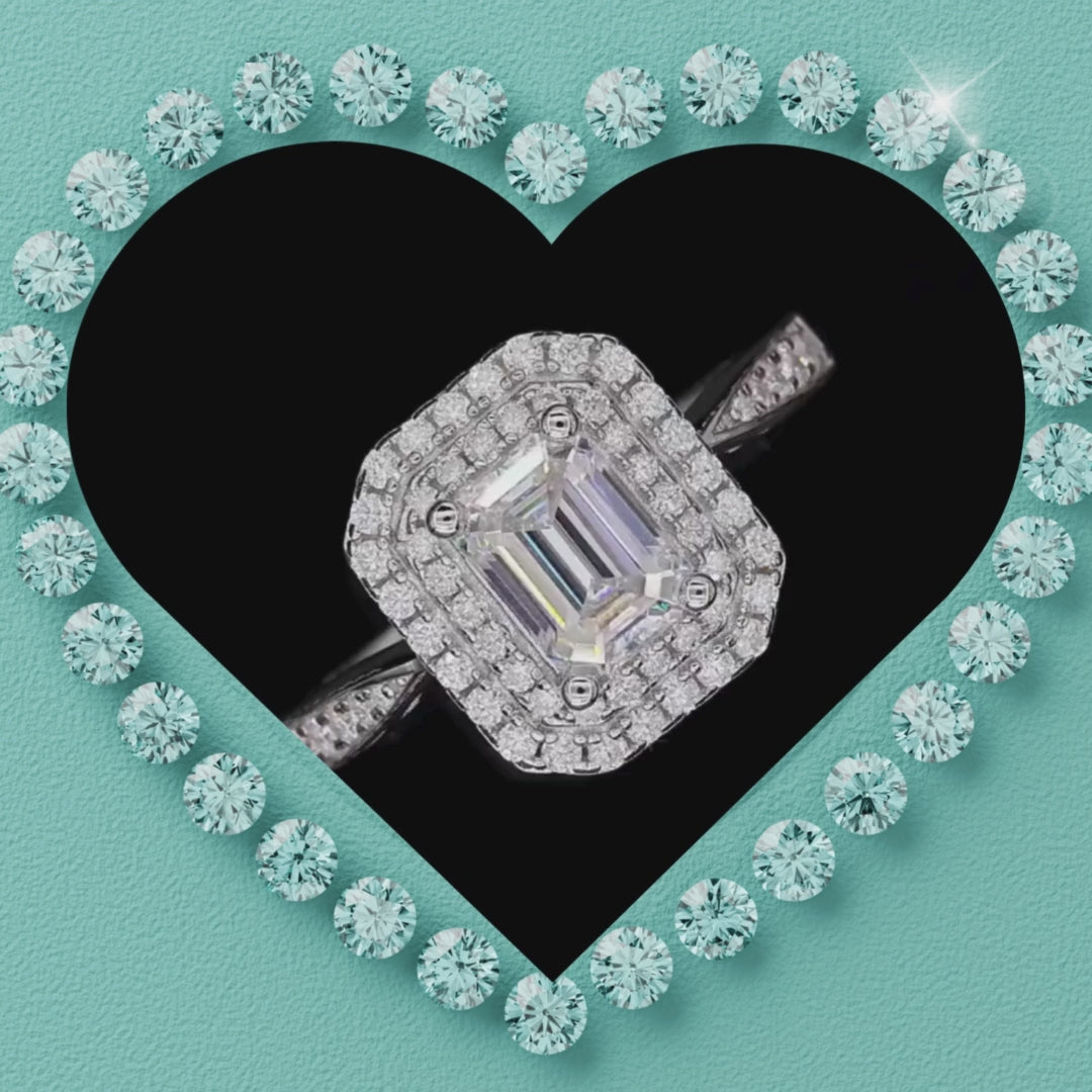 A shimmering double halo surrounds the centre stone, softening the geometric cut while enhancing its size and radiance. Pavé-set stones along the shoulders add a delicate glow, creating a perfectly balanced design that feels luxurious without being overdone.