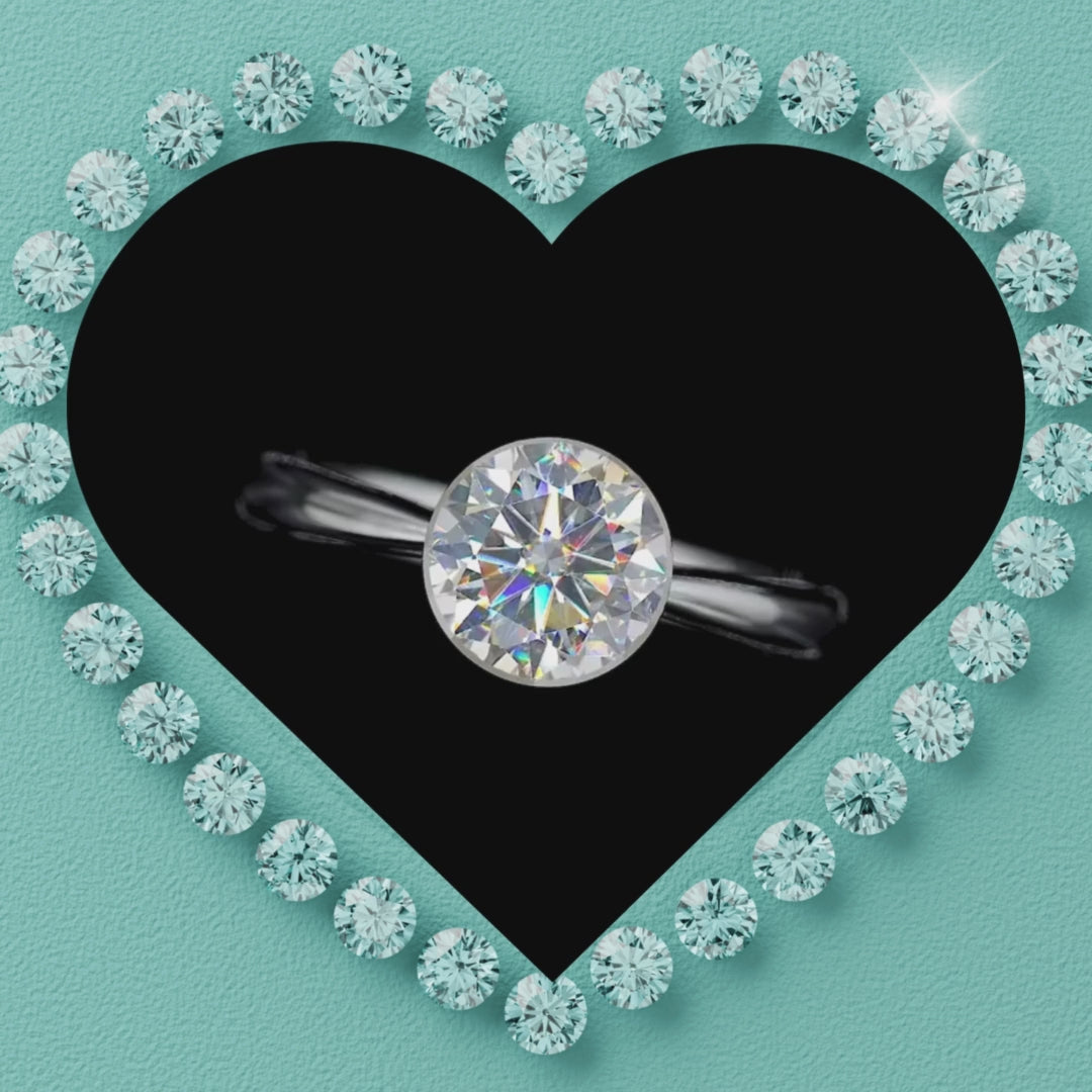 A 2-carat round brilliant moissanite diamond invisible setting ring with an invisible setting, displayed in a heart-shaped setting with surrounding smaller stones.